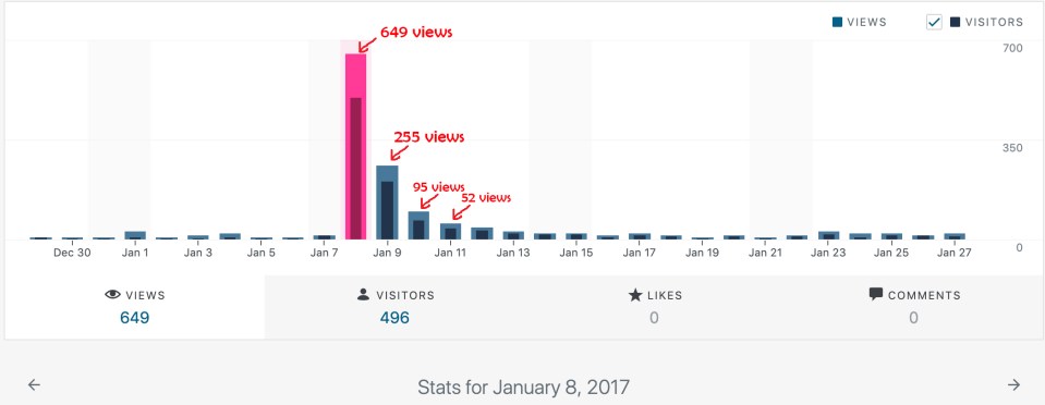 不過你看那個數據就知道,3天過後又沒什麼人點閱了。不過,也不完全回到了原點。平日的點閱量還是從原先的0人增加到了10人。